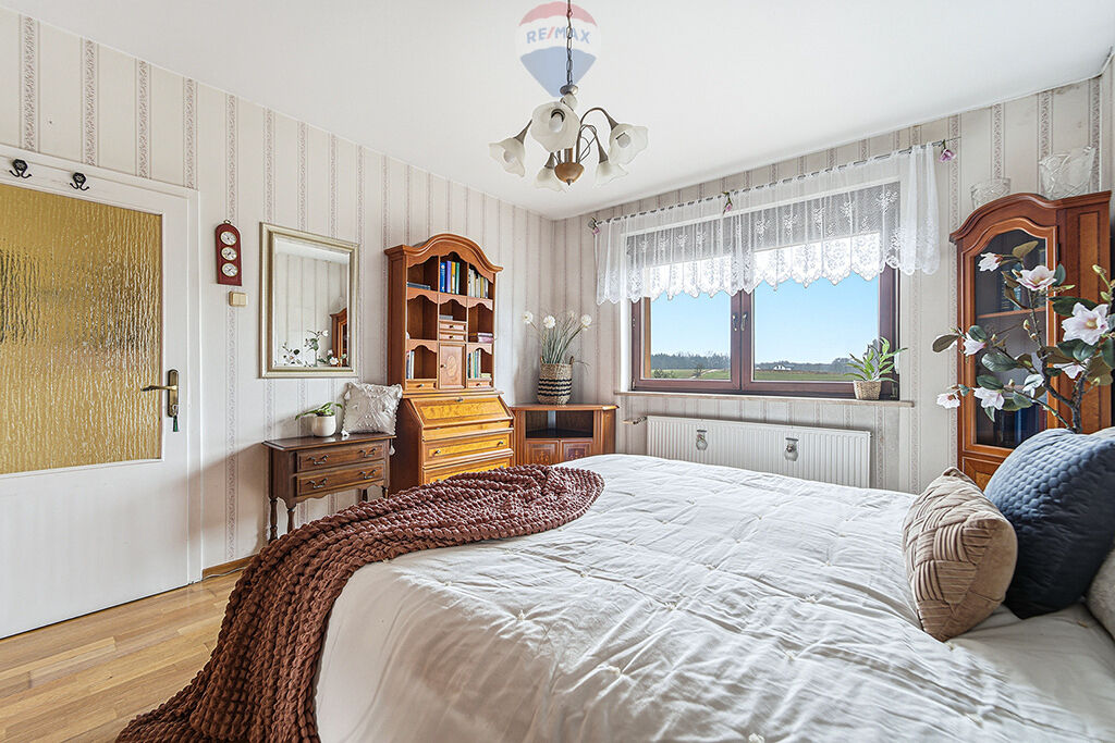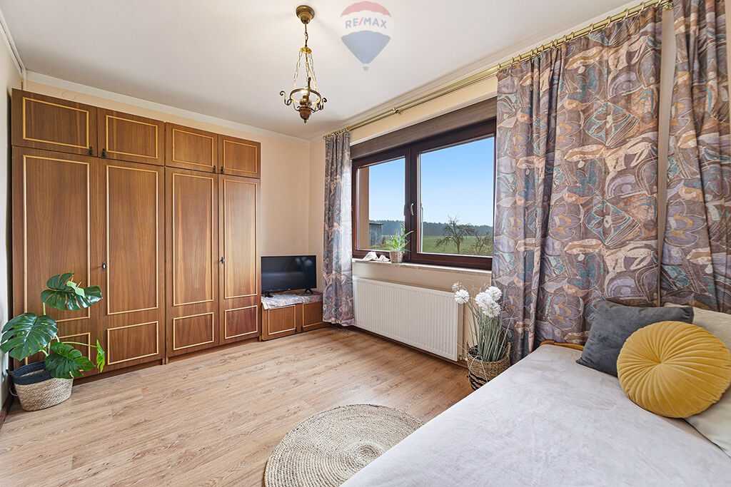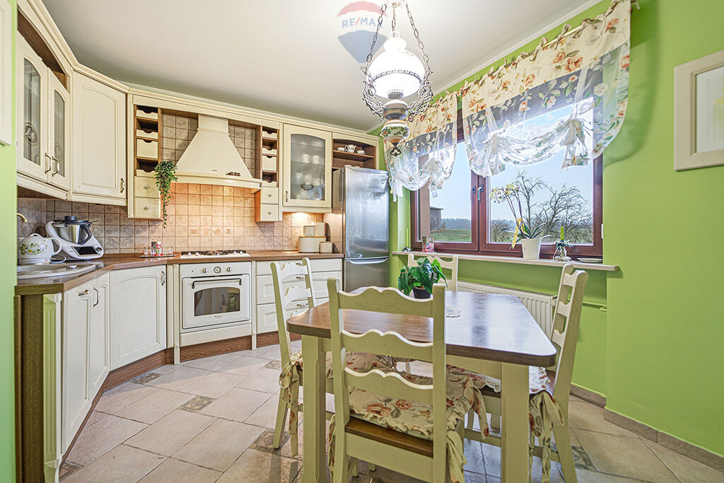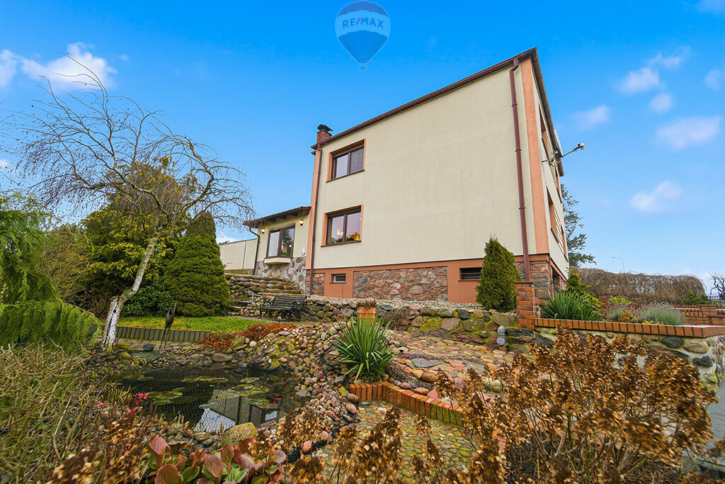 oferuje: 6 pokoi, 4 sypialnie, 2 łazienki, ogród, staw, taras z