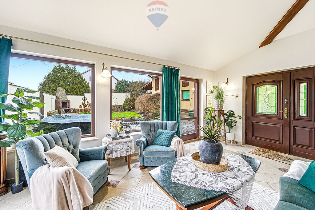 sypialnie, salon i ogród zimowy. W domu są 2 łazienki oraz